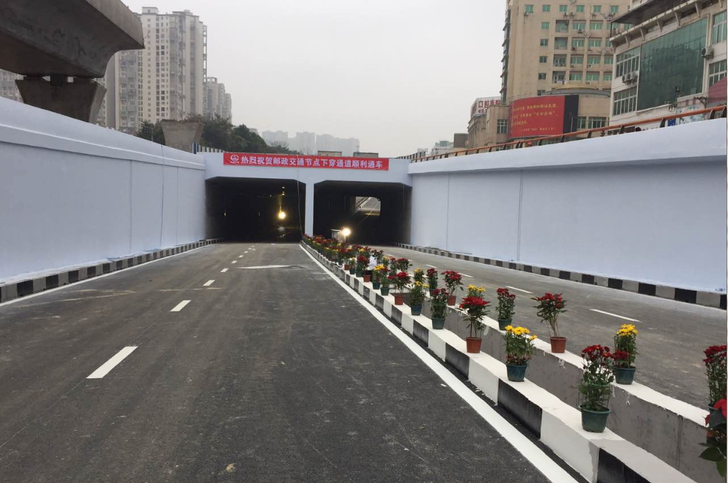 郵政交通節(jié)點項目起于蓮莊北路順康汽車檢測中心處,終于瑞德酒店門口,采取“主線下穿、左轉高架”方案,設下穿通道下穿南環(huán)西路與南環(huán)中路交叉口,全長700米,凈寬2×8.5米,其中暗埋段長度為120米,敞開段(U型槽)長275米;南環(huán)路往溪南南路方向設左轉匝道高架,橋長246米,兩側引道擋墻全長117米,項目總投資約1.4億元。
